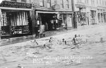 Description :MONTAGE JUMELANT UNE SCENE DE PLAGE A LA RUE WELLINGTON NORD . A L'ARRIERE-PLAN, DIFFERENTS COMMERCES DE LA RUE WELLINGTON NORD: WOOLWORTH, SEARS, ECT. DEVANT CES MAGASINS DES GAMINS S'ADONNENT A LA BAIGNADE. L'ILLUSION EST BIEN RENDUE.
