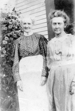 Description :UNE FEMME AGEE AVEC UNE ROBE A POIS ET UN TABLIER BLANC. UNE FEMME PROBABLEMENT MRS. FRANCIS AGEE D'UNE QUARANTAINE D'ANNEES CA PORTANT UNE ROBE CLAIRE AVEC COL HAUT ET BROCHE. DANS LE COIN GAUCHE, DES FLEURS GRIMPANTES. DERRIERE LES PERSONNES...