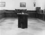 Description :AU CENTRE EST DISPOSE LE PUPITRE CENTRAL POUR LES CLIENTS, AUTOUR LES GUICHETS EN CHENE AVEC GRILLES. UNE VIEILLE HORLOGE A PENDULE EST SUR LES MURS.