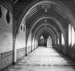 Description :DES ARCS EN VOUTE DE BRIQUES SUPPORTENT LE TOIT. LE PLANCHER DE PIERRES DE DIFFERENTES COULEURS FORME UN DAMIER. PORTE TRIANGULAIRE.