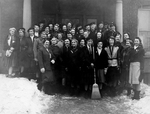 Description :RASSEMBLEMENT DU GROUPE FEMININ DE CURLING DEVANT UN EDIFICE EN BRIQUES AVEC COLONNES. LA 5E DE LA PREMIERE RANGEE PORTANT UN BALAI EST MME ISABEL RACEY.