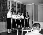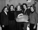 Description :DE GAUCHE A DROITE EN ARRIERE-PLAN: DERBIE QUENTIN, MARY TOAD, ISABEL RACEY ET UNE INCONNUE. EN AVANT-PLAN DE GAUCHE A DROITE: LA DERNIERE EST MME BABE ST-ONGE. EN AVANT-PLAN, LE SERVICE DE THE EN ARGENT SERVANT DE TROPHEE.