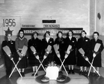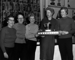 Description :DES JOUEUSES DE CURLING SONT ASSEMBLEES AUTOUR D'UN SET DE THE, TROPHEE · GAGNER LORS DE LA COMPETITION RAND DU BONSPIEL DE 1956. LES GAGNANTES SONT · GAUCHE. IL S'AGIT DU CLUB DE MAGOG. DE GAUCHE A DROITE: MME J. BOGERT, MME L. CYR, MME G. ...