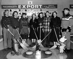 Description :DE GAUCHE A DROITE: DOUG RACEY, LA 4E MME MAUDE MCPHERSON, LE 6E M. BERT ROSS SUIVI DE MME AUDREY HAND. LES GAGNANTS SONT SUR LA GLACE, LEUR BALAI A LA MAIN. DEVANT EUX, DES PIERRES DE CURLING ET DES MASCOTTES: UN ALLIGATOR EMPAILLE, UN COCHON...