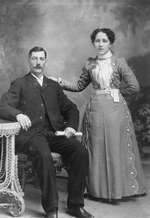 Description :L'HOMME ASSIS PORTE LA MOUSTACHE. LA FEMME DEBOUT PRES DE LUI EST CORPULENTE.