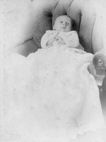 Description :1.1 JEUNE BEBE COUCHE SUR UNE CHAISE, ENVELOPPE D'UNE LONGUE COUVERTURE. 1.2 JEUNE ENFANT ASSIS SUR UNE CHAISE EN ROBE DE DENTELLE. IL EST NU-PIED.