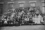 Description :PORTRAIT D'UN GROUPE DE JEUNES FILLES ASSISES DANS UN ESTRADE. LA 3E DE LA DEUXIEME RANGEE A DROITE EST ADELE ROYER LEPINE.