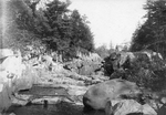 Description :ON RETROUVE TROIS JEUNES GARCONS QUI SONT INSTALLES SUR DES ROCHERS A UN ENDROIT OU COULE UN RUISSEAU. LE GARCON EN HAUT A DROITE EST JEAN-BAPTISTE LEPINE.