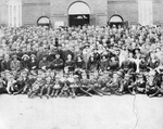 Description :DES MAIRES ET EMPLOYES MUNICIPAUX DE DIFFERENTES VILLES PRENNENT LA POSE DEVANT L'ENTREE DU CLUB SOCIAL. ON APERCOIT LES GROSSES COLONNES IONIQUES DE L'EDIFICE ET SON BALCON. AU PREMIER RANG, LE 3E ASSIS EST LE MAIRE TRUDEAU.