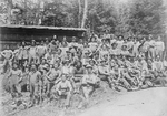 Description :UNE SOIXANTAINE DE TRAVAILLEURS FORESTIERS PRENNENT LA POSE DEVANT LEUR CAMP DE BOIS ROND. LA PLUPART PORTENT SALOPETTE ET CHAPEAU ROND.