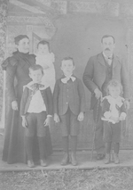Description :PORTRAIT THEATRAL A FAUX DECOR, L'HOMME, LA FEMME (TENANT UN JEUNE ENFANT DANS SES BRAS) ET LES TROIS ENFANTS SONT DEBOUT.