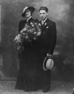 Description :PHOTO DE NOCES DANS UN DECOR EN TROMPE-L'OEIL. LA FEMME EST GRANDE ET ELANCEE, HABILLEE DE VELOURS. L'HOMME PORTE GANTS ET CHAPEAU.