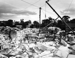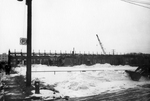 Description :ETAPES DE LA DEMOLITION DE L'ANCIENNE ARMATURE DE LA JENCKES. ON VOIT DES PARTIES DE MURS EN BRIQUE QUI SONT RATTACHEES AUX POUTRES D'ACIER. UNE GRUE DEPASSE L'EDIFICE. VEHICULES DIVERS STATIONNES A PROXIMITE.
