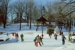 Description :PATINEURS SUR L'ETANG DU DOMAINE HOWARD. CABINE POUR SE RECHAUFFER. ARBRES ET MAISON. PARC DE LA VILLE.