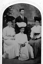 Description :PORTRAIT DE FAMILLE: MADAME LEONILDE-CHARLES BACHAND (GEORGINE CAMIRAND) ET SON FILS LEONIDAS EN COMPAGNIE D'UNE COUSINE, OLIVIA-GEORGINE DEJOURDY AINSI QU'UNE AUTRE PERSONNE NON IDENTIFIEE.