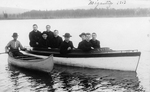 Description :UNE CHALOUPE AYANT A BORD 8 FRERES DU SACRE-COEUR EST ACCOMPAGNEE D'UNE PETITE CHALOUPE DANS LE COIN GAUCHE AVEC RAMEUR ACCOMPAGNANT LA PRECEDENTE.