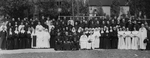 Description :NOMBREUX JEUNES, GARCONS ET FILLES, POSENT EN VETEMENTS RELIGIEUX REPRESENTANT DIFFERENTES COMMUNAUTES MISSIONNAIRES OU RELIGIEUSES EN GENERAL. UNE SEULE ENFANT EST IDENTIFIEE: CELINE ROY (1ere RANGEE, 7E) HABILLEE EN SOEUR TOURIERE.