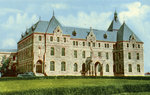 Description :VASTE EDIFICE EN PIERRE AVEC TOIT EN PENTE, DOTE DE LUCARNES AVEC FENETRES A LATUDOR ET EN OGIVE. PORTAIL AVEC BALUSTRADE AU SOMMET. NOMBREUX ORNEMENTS.