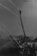 Description :UN POMPIER EST MONTE TRES HAUT DANS L'ECHELLE MECANIQUE D'UN CAMION ET DIRIGE SON JET D'EAU. DE NOMBREUX AUTRES POMPIERS AU SOL FONT DE MEME. LES JETS SONTS DIRIGES DANS LA RIVIERE MAGOG (LAC DES NATIONS). A L'ARRIERE-PLAN, L'USINE DE LA PATON...