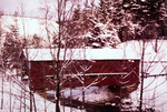 Description :DANS UN PAYSAGE D'HIVER ON DISTINGUE PARMI LES ARBRES DENUDES LE PONT COUVERT, TOUT EN BOIS, ET DE COULEUR ROUGE.
