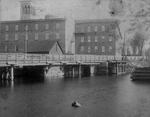 Description :DERRIERE LE PONT MONTCALM, EN BOIS A L'EPOQUE, LES DEUX EDIFICES DE L'USINE PATON. CABANE OU ETAIT INSTALLEE LA TURBINE.