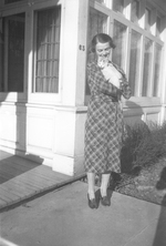 Description :UNE FILLE DE M. POULIN CARESSE UN CHAT. EN AVANT-PLAN DEVANT L'ENTREE DE LA MAISON: VERANDA EN BOIS AVEC FENETRES RECTANGULAIRES. SUR LE COIN DE LA MAISON, LE CHIFFRE 63 (ACTUEL 1103).