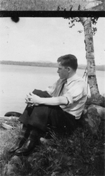 Description :PIERRE POULIN, FILS DE J.A. POULIN EST ADOSSE A UN ARBRE. EN ARRIERE-PLAN LE PETIT LAC MAGOG.