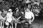 Description :DE GAUCHE A DROITE, GEMMA, JACQUELINE, MADAME POULIN ET UN MONSIEUR SONT ASSIS SUR UN PETIT BANC. DERRIERE MAISON EN BRIQUES ET ARBRES.
