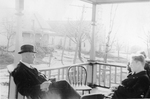 Description :GALERIE EN BOIS OU CONVERSENT DEUX INDIVIDUS. EN ARRIERE-PLAN, MAISON A GAUCHE ET EGLISE A DROITE.