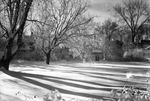 Description :LE PARC MITCHELL. LE SOL ET LES ARBRES SONT RECOUVERTS DE LA NEIGE. AU LOIN, LA FONTAINE ET LES TOITURES DES MAISONS SITUEES SUR LA RUE MITCHELL.