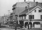 Description :VUE SUR LE COIN KING ET WELLINGTON. SUR LA RUE WELLINGTON, AU COIN LA BOULANGERIE FLETCHER; MANUFACTURE DE VETEMENT WALTER BLUE; QUINCAILLERIE CODERE; EPICERIE & SPIRITUEUX L. PROULX & CO.: PASSANT DANS LA RUE, UNE VOITURE ATTELEE A UN CHEVAL ...