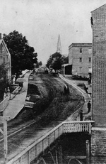 Description :LA RUE DUFFERIN A PARTIR DU PONT MAGOG: UNE PARTIE DU BLOC GRIFFITH, L'ANCIEN EDIFICE BROOKS ET AU LOIN, L'EGLISE PLYMOUTH TRINITY. A GAUCHE, LA RESIDENCE G.R. ROBERTSON, LES TROTTOIRS SONT EN BOIS.