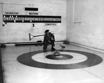 Description :M. SANGSTER A DEMI ACCROUPI LANCE SA PIERRE DE CURLING, UN BALAI DANS SA MAIN GAUCHE. IL PORTE UN HABIT ET UNE CRAVATE ET EST COIFFE D'UN BERET. LES MURS SONT NUS SAUF CELUI DU FOND SUR LEQUEL ON INSCRIT LE POINTAGE. LA SCENE SE PASSE PROBABLE...