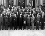 Description :49 NOTAIRES DEVANT LA PORTE DU PALAIS DE JUSTICE, RUE PALAIS. 1ER RANG DE GAUCHE A DROITE: MES EDOUARD BOUDREAU, (SHERBROOKE); DOMINIQUE PELLETIER, (MONTREAL); YVES MONTREUIL, (QUEBEC), SYNDIC; L'HON. CYRILLE DELAGE, (QUEBEC); EDOUARD BIRON,...
