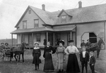 Description :FACADE D'UNE RESIDENCE UNIFAMILIALE DE COATICOOK. DEVANT LA MAISON, UNE FAMILLE PAYSANNE ET DEUX VOITURES A CHEVAUX CONDUITENT PAR DES HOMMES.