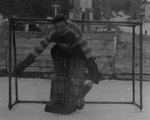 Description :GARDIEN DE BUT ANDRE PARR PORTANT JAMBIERES ET GANTS ATTRAPPE-RONDELLE. GILET RAYE AVEC ECUSSON DE LA FEUILLE D'ERABLE. EN ARRIERE-PLAN, LE BUT FAIT DE FILETS ET UNE CLOTURE EN PLANCHES.
