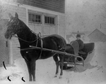 Notes :INSCRIPTION IDENTIFIANT LE PERSONNAGE ET LA DATE DE LA PHOTO ORIGINALE AU RECTO. LE BRANCARD DE LA VOITURE, AUSSI APPELE AU QUEBEC UNE PAIRE DE MENOIRES, COMPORTE DEUX LONGUES PIECES DE BOIS. PAR AILLEURS, LE SON DES GRELOTS AVERTISSAIT AU LOI...