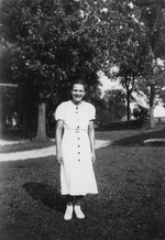 Description :LUCIA HAYNES PORTE UNE ROBE A MI-MOLLET BLANCHE ET SOULIERS BLANCS. DERRIERE, ARBRES, PELOUSE TONDUE, ALLEE DE PIERRES CONCASSEES.