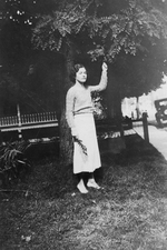 Description :3.1 Mme MEUNIER PORTE UN GILET DE LAINE GAUFFRE ET UNE JUPE CLAIRE, UN PEU AU DESSUS DE LA CHEVILLE. ELLE PREND LA POSE THEATRALE, TENANT DANS SA MAIN GAUCHE UN BOUQUET ET TOUCHANT DE SA MAIN DROITE LE FEUILLAGE DE L'ARBRE. DERRIERE ELLE UNE M...