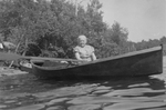 Description :Mme NARCISSE MARTIN EST ASSISE DANS UNE CHALOUPE SUR LES RIVES DE LA RIVIERE ST-FRANCOIS. EN ARRIERE-PLAN DES ARBRES. ELLE PORTE UNE ROBE FLEURIE A MANCHES COURTES.