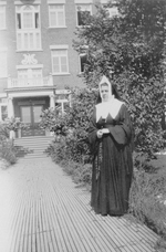 Description :6.1 MERE ST-FRANCOIS, RELIGIEUSE DE LA CONGREGATION DE NOTRE-DAME, DEVANT L'ENTREE DU VIEUX COUVENT MARIE IMMACULEE. ELLE PORTE UNE SOUTANE NOIRE AVEC CHAPELET A LA TAILLE. 6.2 PLAN RAPPROCHE DE MERE ST-FRANCOIS TENANT LIVRE A LA MAIN, CRUCIFI...