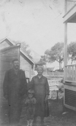 Description :DE GAUCHE A DROITE: M. MARTIN, SON FILS ET Mme MARTIN. M. MARTIN A UNE MOUSTACHE ET PORTE UN COSTUME DIFFICILE A DISTINGUER. Mme MARTIN PORTE UNE ROBE CACHANT LES MOLLETS. L'ENFANT PORTE CULOTTES COURTES. A L'EXTREMITE DROITE, MAISON AVEC 2 GA...