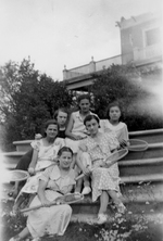 Description :ASSISES SUR LES MARCHES LES RAQUETTES A LA MAIN, VETUES DE ROBES RAYEES, FLEURIES ET A POIS, 6 FEMMES. EN ARRIERE-PLAN, RESIDENCE AVEC SUPERBE GALERIE AU 2e ETAGE.