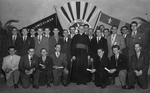 Description :21 FINISSANTS ET 3 DIGNITAIRES DONT UN RELIGIEUX. EN AVANT-PLAN, LES ETUDIANTS SEMBLENT AVOIR UN DIPLOME A LA MAIN. A L'ARRIERE, DRAPEAUX DU QUEBEC ET DE L'AMBULANCE ST-JEAN. DE GAUCHE A DROITE, PREMIERE RANGEE: RAOUL ST-CYR, ROLAND DIONNE, YO...