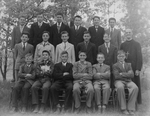 Description :LES ELEVES PORTENT TOUS LA CRAVATE SAUF UN. COSTUMES DIVERS. EN AVANT-PLAN DE GAUCHE A DROITE: PIGEON, VILLENEUVE, MAURICE AUDET, MAURICE ST-PIERRE, RICHARD ET MARTEL SONT ASSIS SUR DES CHAISES. 2e RANGEE: MARCELLIN ALLARD, LEMAY, YVON LEBLANC...