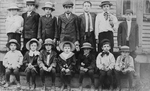 Description :EN ARRIERE-PLAN, BATISSE DE PLANCHES A CLINS, POTEAUX DE GALERIE EQUARRIS. DE GAUCHE A DROITE, ASSIS SUR LES MARCHES EN AVANT: CONRAD CARTIER, ? , GEORGES CHARLAND, HERVE LAMBERT, RENE ROY, EDOUARD FOULON, ALBERT CHARLAND (DIT TI-NINE). DEBOUT...