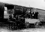 Description :EN AVANT-PLAN DES TRAVAILLEURS DEBOUT SUR DES PLANCHES, DANS UNE CHARRETTE A ROUES DE BOIS TIREE PAR UN ATTELAGE DE 2 CHEVAUX, VONT LIVRER LEUR MARCHANDISE A UN TRAIN. LES WAGONS PORTENT LES INSCRIPTIONS GRAND TRUNK 3185 ET INTERCOLO (NIAL) PR...