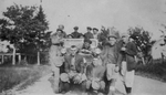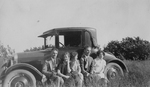 Description :7.1 EN ARRIERE-PLAN, AUTO PROBABLEMENT FORD MODELE T AVEC PARE-SOLEIL ET ROUE DE SECOURS A L'ARRIERE. DEVANT: ? , ? , ? , RENE FORTIN, ?. RENE FORTIN PORTE UNE CRAVATE AUX CHEVEUX.