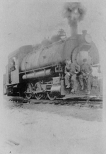 Description :LES FRERES LEBLANC. DE GAUCHE A DROITE: ROSARIO, ALBERT ET OLIVA. ROSARIO LE CONDUCTEUR ET ALBERT ET OLIVA SONT ASSIS A L'ARRIERE DE LA LOCOMOTIVE.