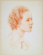 Description :PORTRAIT AU CRAYON (SANGUIN) EXECUTE PAR MAURICE BIRON MONTRANT LA TETE ET LES EPAULES DE MME SHEA. LA JEUNE FEMME REGARDE VERS SA DROITE. SES CHEVEUX SONT COIFFES VERS L'ARRIERE.